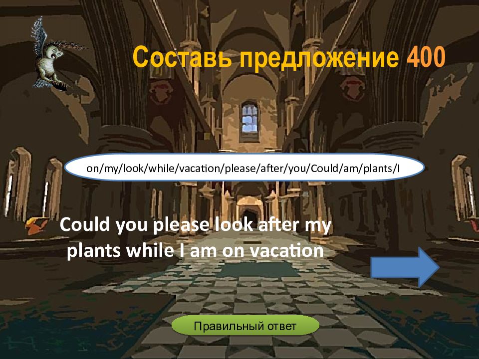 Could you please look after my plants while I am on vacation on/my/look/while/vacation/please/after/you/Could/am/plants/I Составь предложение 4 00 Правильный ответ