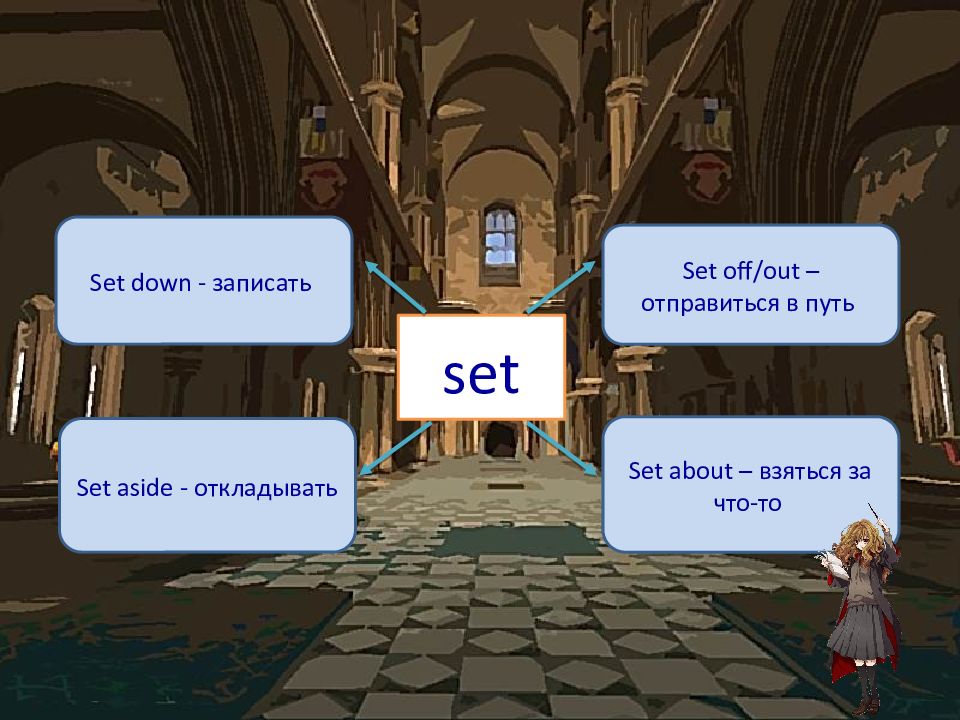 set Set down - записать Set off/out – отправиться в путь Set aside - откладывать Set about – взяться за что-то