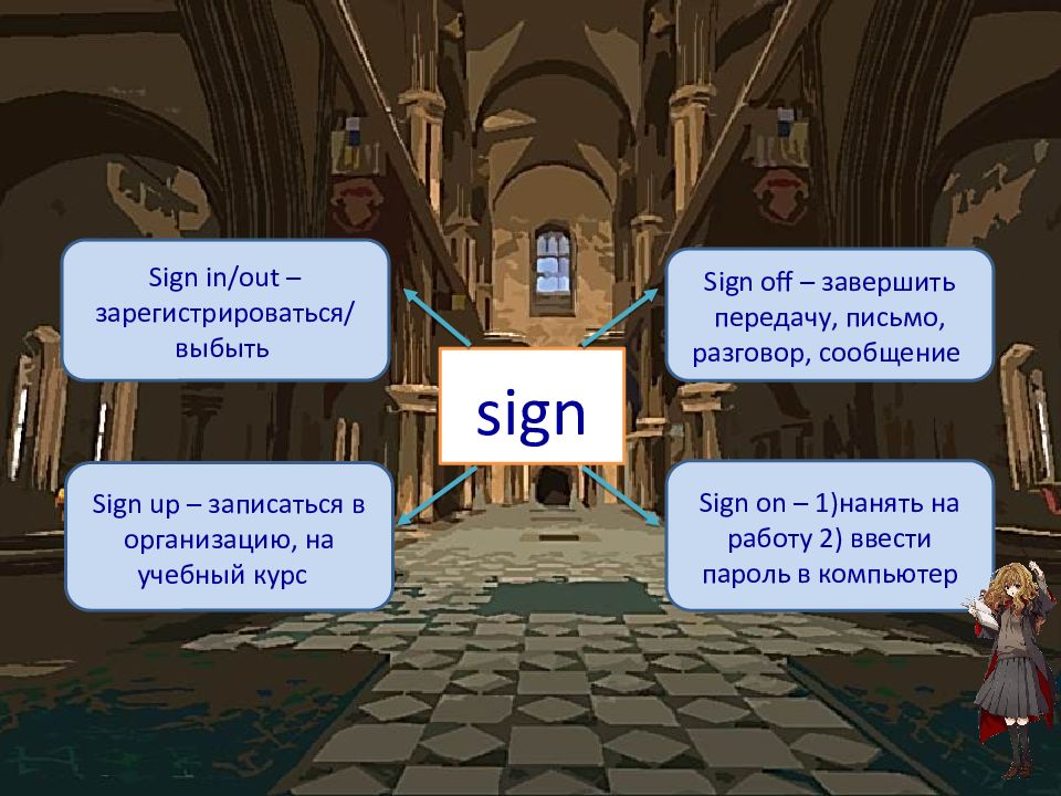 sign Sign in/out – зарегистрироваться/ выбыть Sign off – завершить передачу, письмо, разговор, сообщение Sign up – записаться в организацию, на учебный курс Sign on – 1)нанять на работу 2) ввести пароль в компьютер
