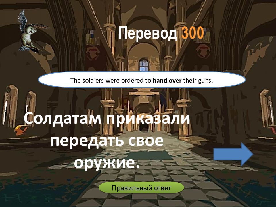 Солдатам приказали передать свое оружие. The soldiers were ordered to hand over their guns. Перевод 3 00 Правильный ответ