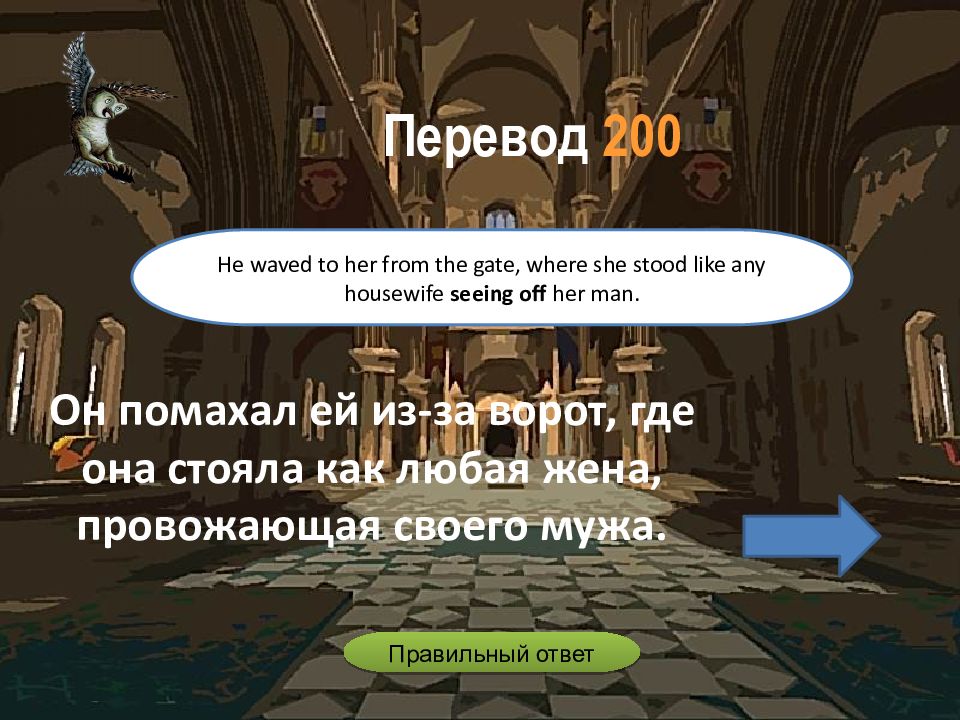 Он помахал ей из-за ворот, где она стояла как любая жена, провожающая своего мужа. He waved to her from the gate, where she stood like any housewife seeing off her man. Перевод 200 Правильный ответ