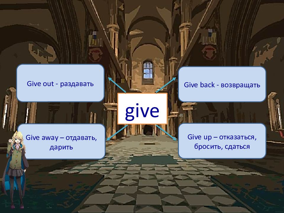 give Give out - раздавать Give back - возвращать Give away – отдавать, дарить Give up – отказаться, бросить, сдаться