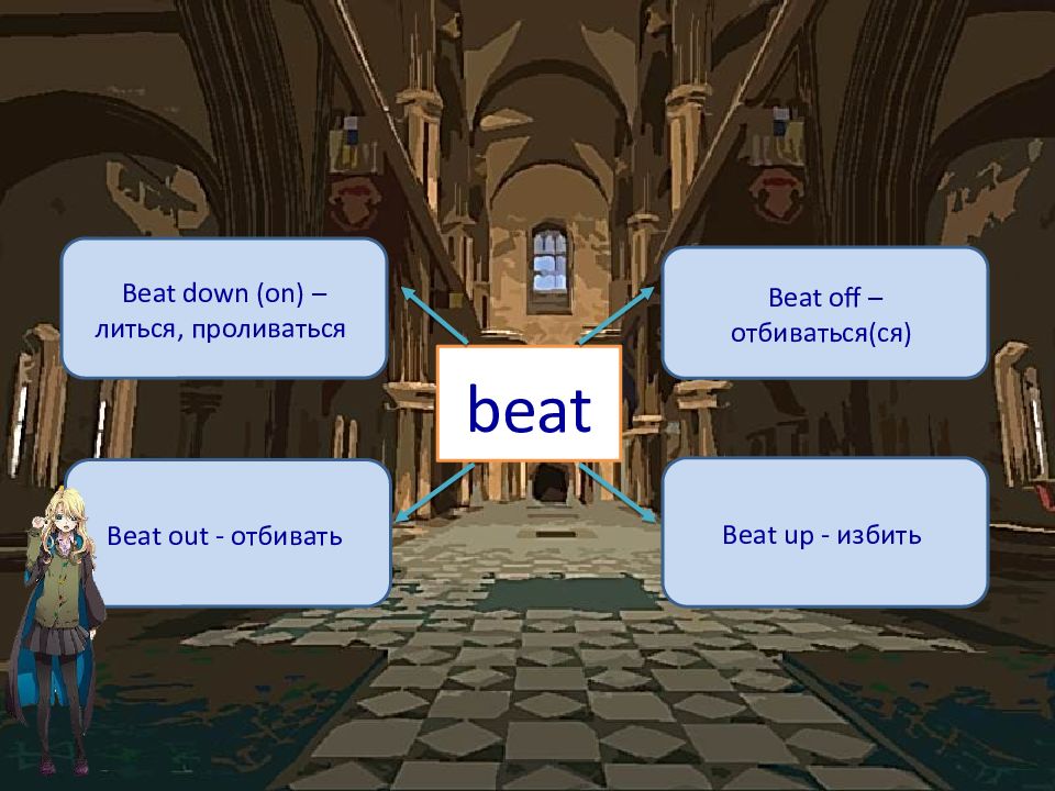 beat Beat down (on) – литься, проливаться Beat off – отбиваться( ся ) Beat out - отбивать Beat up - избить