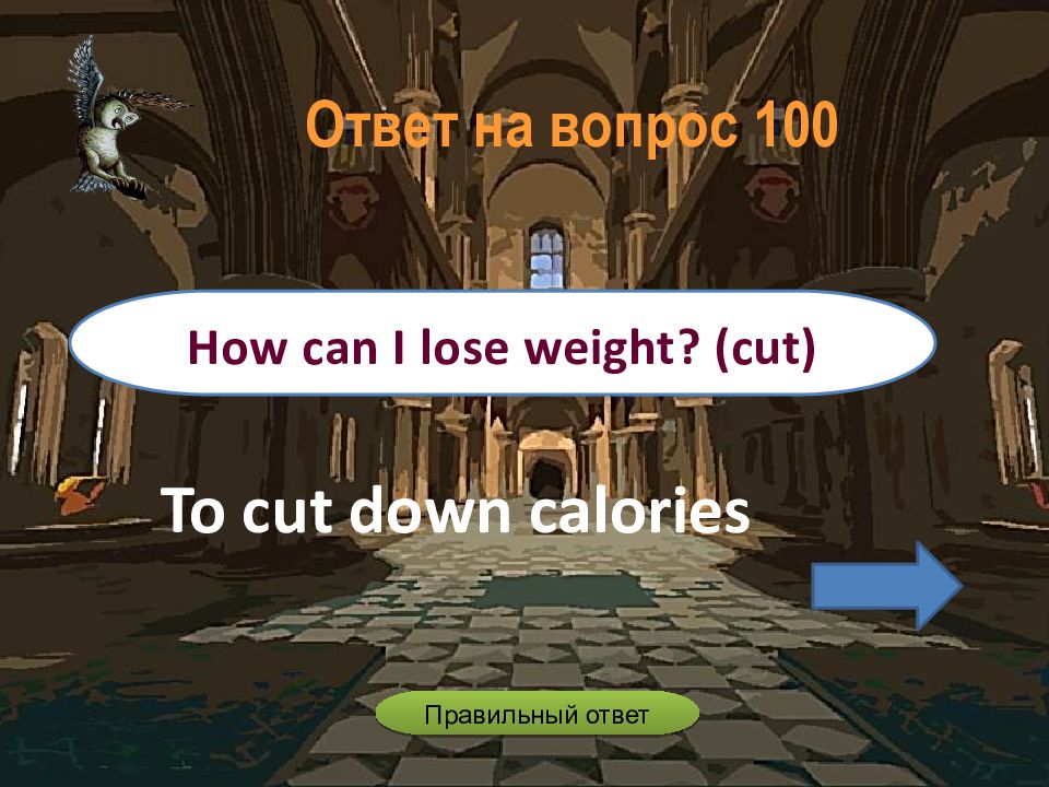 To cut down calories How can I lose weight? (cut) Ответ на вопрос 100 Правильный ответ