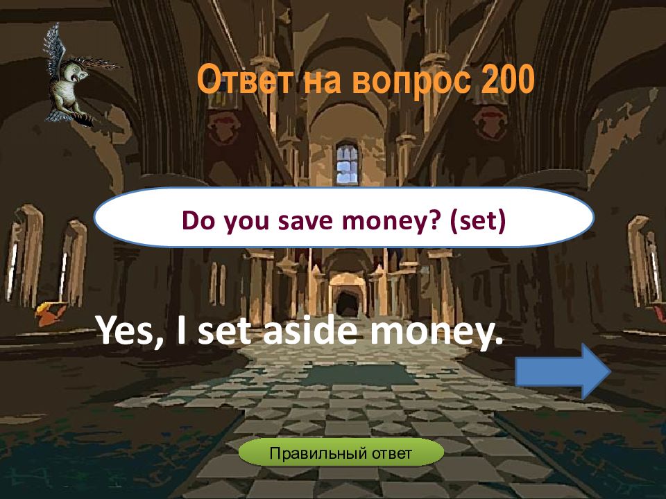Yes, I set aside money. Do you save money? (set) Ответ на вопрос 2 00 Правильный ответ