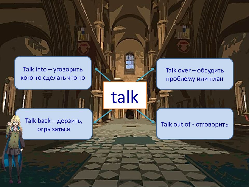 talk Talk into – уговорить кого-то сделать что-то Talk over – обсудить проблему или план Talk back – дерзить, огрызаться Talk out of - отговорить