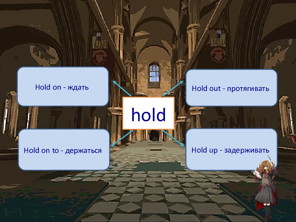 hold Hold on - ждать Hold out - протягивать Hold on to - держаться Hold up - задерживать
