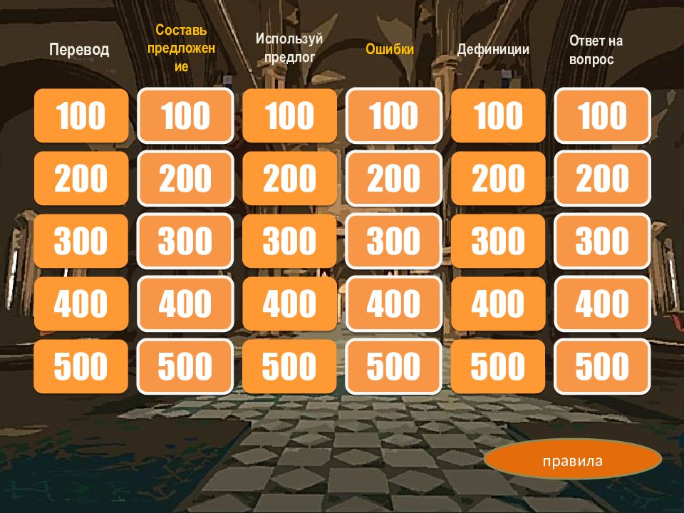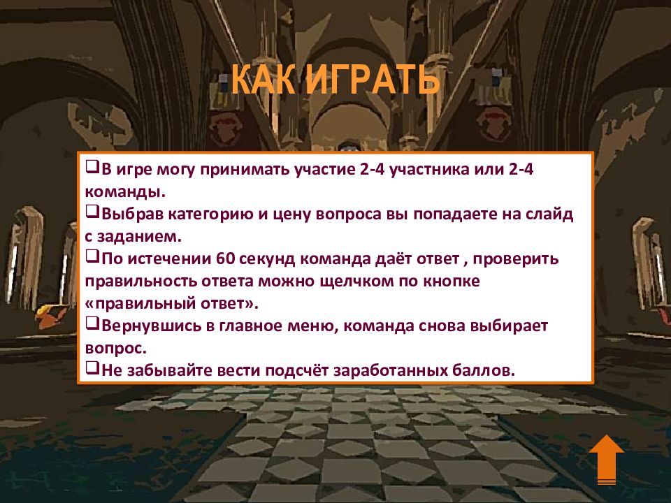 В игре могу принимать участие 2-4 участника или 2-4 команды. Выбрав категорию и цену вопроса вы попадаете на слайд с заданием. По истечении 60 секунд команда даёт ответ, проверить правильность ответа можно щелчком по кнопке «правильный ответ». Вернувшись в главное меню, команда снова выбирает вопрос. Не забывайте вести подсчёт заработанных баллов. КАК ИГРАТЬ
