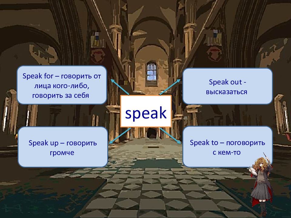 speak Speak for – говорить от лица кого-либо, говорить за себя Speak out - высказаться Speak up – говорить громче Speak to – поговорить с кем-то