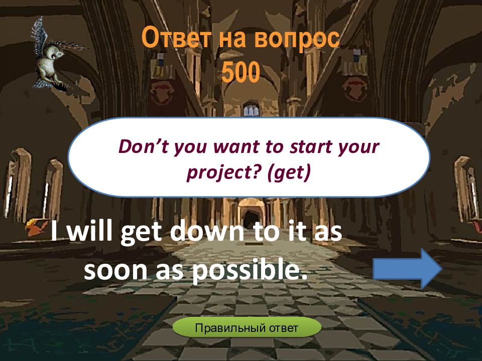 I will get down to it as soon as possible. Don’t you want to start your project? (get) Ответ на вопрос 500 Правильный ответ