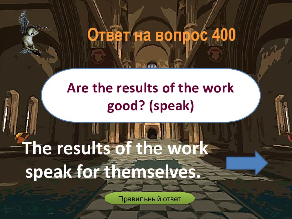 The results of the work speak for themselves. Are the results of the work good? (speak) Ответ на вопрос 400 Правильный ответ