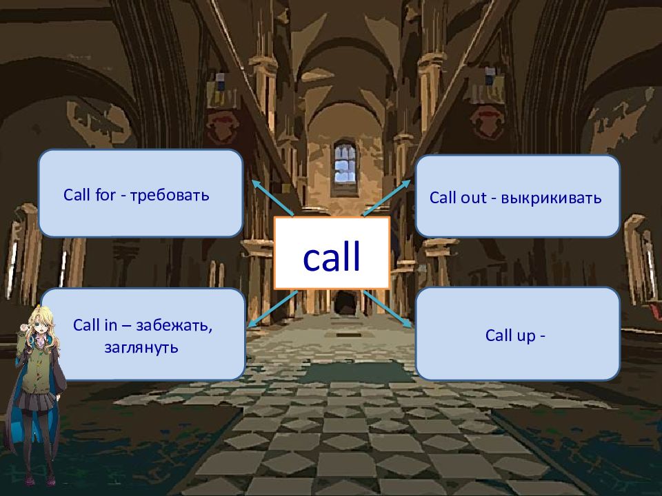 call Call for - требовать Call out - выкрикивать Call in – забежать, заглянуть Call up -