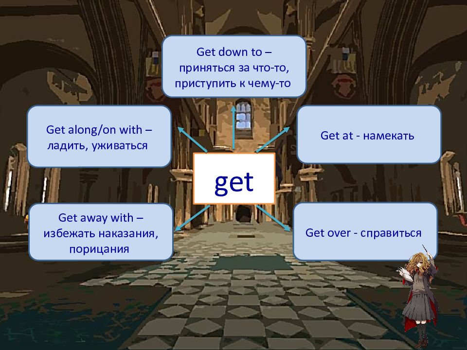 get Get along/on with – ладить, уживаться Get at - намекать Get away with – избежать наказания, порицания Get over - справиться Get down to – приняться за что-то, приступить к чему-то