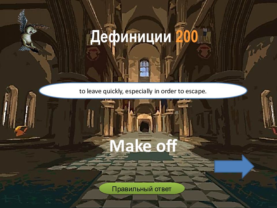 Make off to leave quickly, especially in order to escape. Дефиниции 2 00 Правильный ответ