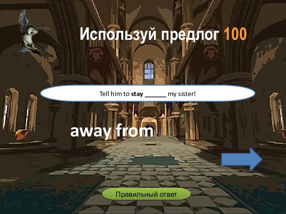 away from Tell him to stay ______ my sister! Используй предлог 100 Правильный ответ