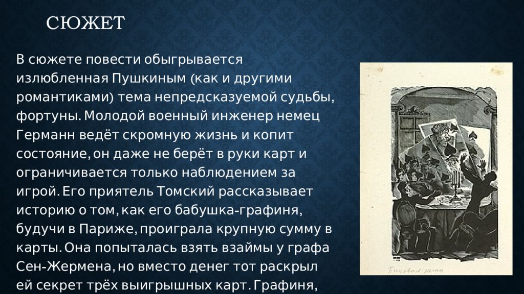 В сюжете повести обыгрывается излюбленная Пушкиным (как и другими романтиками) тема непредсказуемой судьбы, фортуны. Молодой военный инженер немец Германн ведёт скромную жизнь и копит состояние, он даже не берёт в руки карт и ограничивается только наблюдением за игрой. Его приятель Томский рассказывает историю о том, как его бабушка-графиня, будучи в Париже, проиграла крупную сумму в карты. Она попыталась взять взаймы у графа Сен-Жермена, но вместо денег тот раскрыл ей секрет трёх выигрышных карт. Графиня, благодаря секрету, полностью отыгралась.
