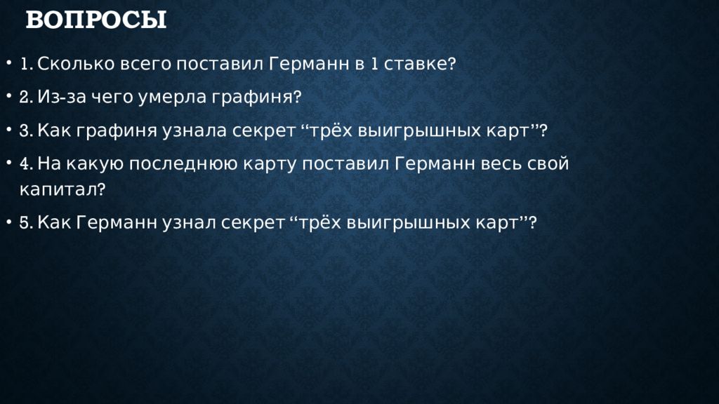 1. Сколько всего поставил Германн в 1 ставке? 2. Из-за чего умерла графиня? 3. Как графиня узнала секрет “ трёх выигрышных карт ” ? 4. На какую последнюю карту поставил Германн весь свой капитал? 5. Как Германн узнал секрет “ трёх выигрышных карт ” ?