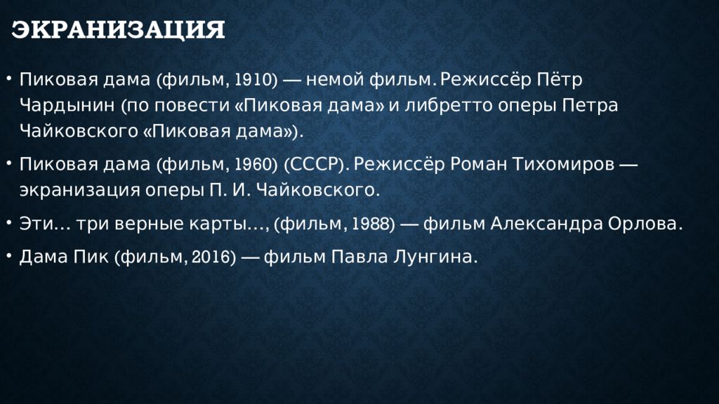 Пиковая дама (фильм, 1910) — немой фильм. Режиссёр Пётр Чардынин (по повести «Пиковая дама» и либретто оперы Петра Чайковского «Пиковая дама »). Пиковая дама (фильм, 1960) (СССР). Режиссёр Роман Тихомиров — экранизация оперы П. И. Чайковского. Эти… три верные карты…, (фильм, 1988) — фильм Александра Орлова. Дама Пик (фильм, 2016) — фильм Павла Лунгина.