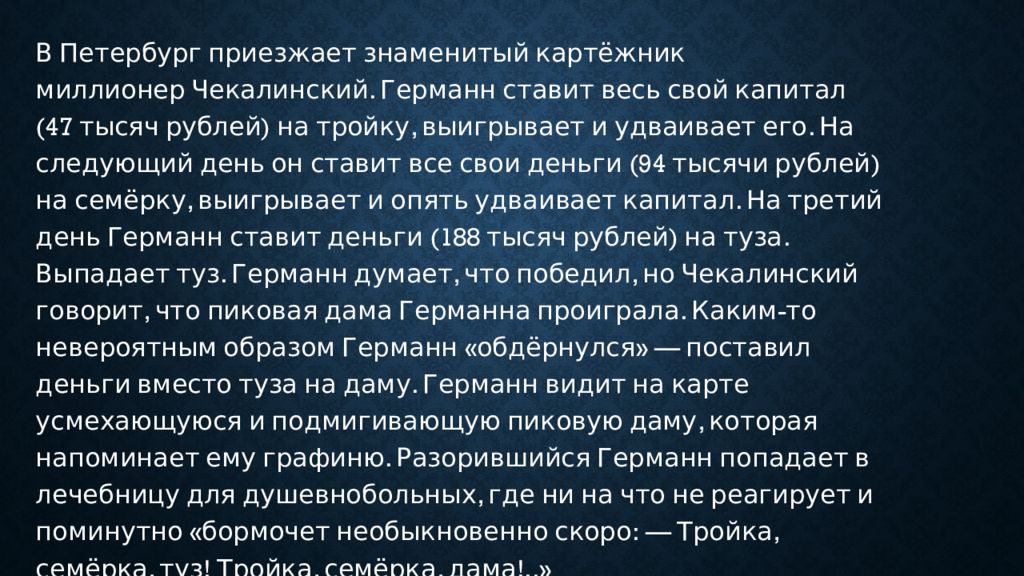В Петербург приезжает знаменитый картёжник миллионер Чекалинский. Германн ставит весь свой капитал (47 тысяч рублей) на тройку, выигрывает и удваивает его. На следующий день он ставит все свои деньги (94 тысячи рублей) на семёрку, выигрывает и опять удваивает капитал. На третий день Германн ставит деньги (188 тысяч рублей) на туза. Выпадает туз. Германн думает, что победил, но Чекалинский говорит, что пиковая дама Германна проиграла. Каким-то невероятным образом Германн «обдёрнулся» — поставил деньги вместо туза на даму. Германн видит на карте усмехающуюся и подмигивающую пиковую даму, которая напоминает ему графиню. Разорившийся Германн попадает в лечебницу для душевнобольных, где ни на что не реагирует и поминутно «бормочет необыкновенно скоро: — Тройка, семёрка, туз! Тройка, семёрка, дама!..»