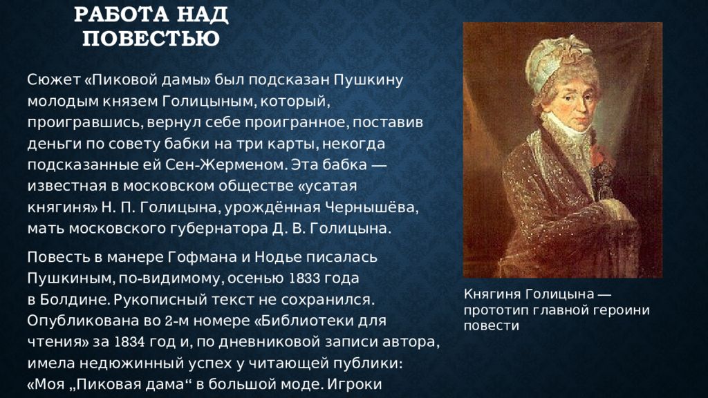 Сюжет «Пиковой дамы» был подсказан Пушкину молодым князем Голицыным, который, проигравшись, вернул себе проигранное, поставив деньги по совету бабки на три карты, некогда подсказанные ей Сен-Жерменом. Эта бабка — известная в московском обществе «усатая княгиня» Н. П. Голицына, урождённая Чернышёва, мать московского губернатора Д. В. Голицына. Повесть в манере Гофмана и Нодье писалась Пушкиным, по-видимому, осенью 1833 года в Болдине. Рукописный текст не сохранился. Опубликована во 2-м номере «Библиотеки для чтения» за 1834 год и, по дневниковой записи автора, имела недюжинный успех у читающей публики: «Моя „Пиковая дама“ в большой моде. Игроки понтируют на тройку, семёрку, туза» (апрель 1834). Княгиня Голицына — прототип главной героини повести