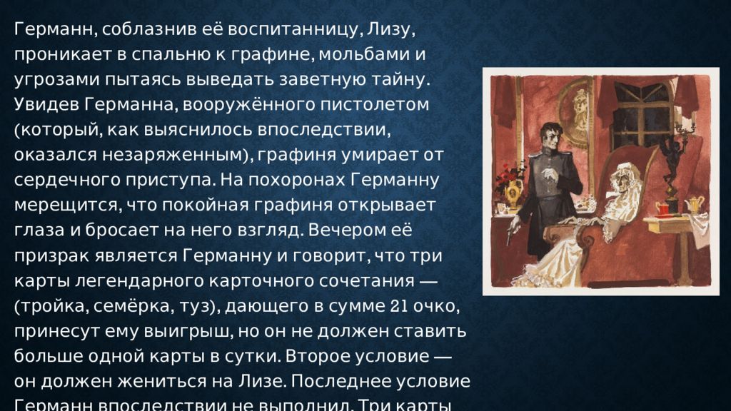Германн, соблазнив её воспитанницу, Лизу, проникает в спальню к графине, мольбами и угрозами пытаясь выведать заветную тайну. Увидев Германна, вооружённого пистолетом (который, как выяснилось впоследствии, оказался незаряженным), графиня умирает от сердечного приступа. На похоронах Германну мерещится, что покойная графиня открывает глаза и бросает на него взгляд. Вечером её призрак является Германну и говорит, что три карты легендарного карточного сочетания — (тройка, семёрка, туз), дающего в сумме 21 очко, принесут ему выигрыш, но он не должен ставить больше одной карты в сутки. Второе условие — он должен жениться на Лизе. Последнее условие Германн впоследствии не выполнил. Три карты становятся для Германна навязчивой идеей.