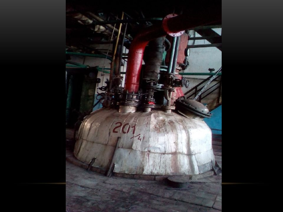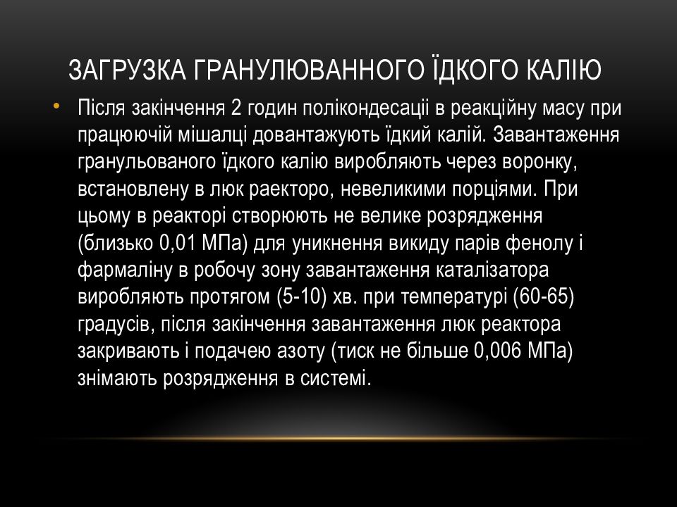 Після закінчення 2 годин полікондесаціі в реакційну масу при працюючій мішалці довантажують їдкий калій. Завантаження гранульованого їдкого калію виробляють через воронку, встановлену в люк раекторо, невеликими порціями. При цьому в реакторі створюють не велике розрядження ( близько 0,01 МПа) для уникнення викиду парів фенолу і фармаліну в робочу зону завантаження каталізатора виробляють протягом (5-10) хв. при температурі (60-65) градусів, після закінчення завантаження люк реактора закривають і подачею азоту ( тиск не більше 0,006 МПа) знімають розрядження в системі.