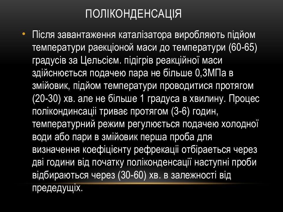 Після завантаження каталізатора виробляють підйом температури раекціоной маси до температури (60-65) градусів за Цельсієм. підігрів реакційної маси здійснюється подачею пара не більше 0,3МПа в змійовик, підйом температури проводитися протягом (20-30) хв. але не більше 1 градуса в хвилину. Процес полікондинсаціі триває протягом (3-6) годин, температурний режим регулюється подачею холодної води або пари в змійовик перша проба для визначення коефіцієнту рефрекаціі отбіраеться через дві години від початку поліконденсації наступні проби відбираються через (30-60) хв. в залежності від предедущіх.