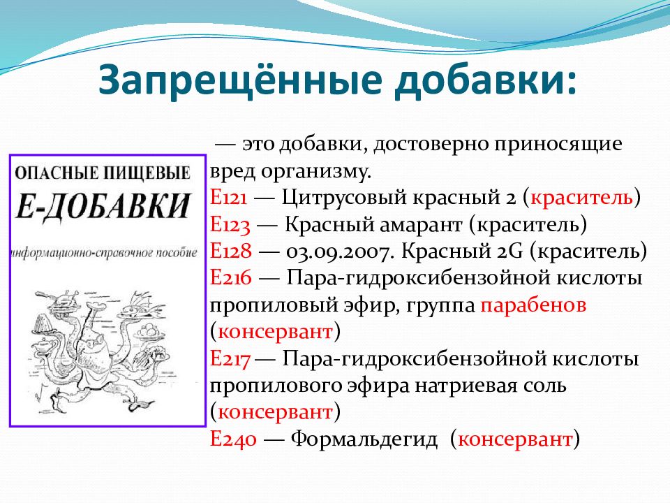 — это добавки, достоверно приносящие вред организму. E121 — Цитрусовый красный 2 ( краситель ) E123 — Красный амарант (краситель) E128 — 03.09.2007. Красный 2G (краситель) E216 — Пара-гидроксибензойной кислоты пропиловый эфир, группа парабенов ( консервант ) E217 — Пара-гидроксибензойной кислоты пропилового эфира натриевая соль ( консервант ) E240 — Формальдегид ( консервант )