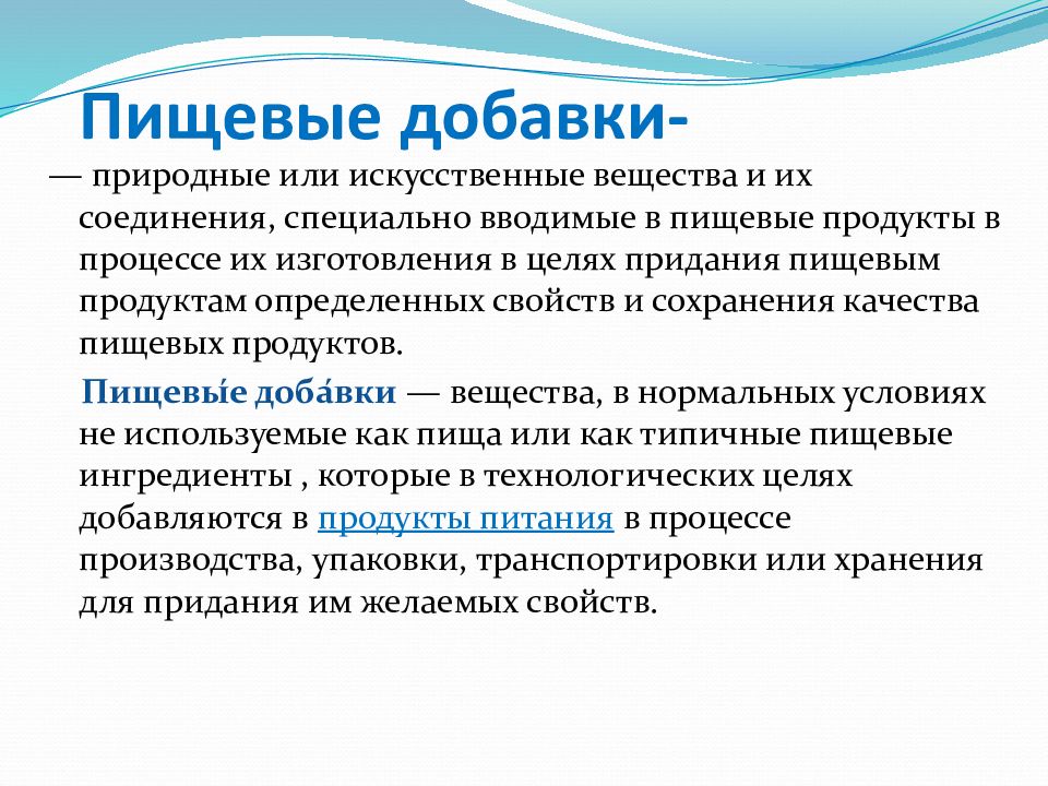 — природные или искусственные вещества и их соединения, специально вводимые в пищевые продукты в процессе их изготовления в целях придания пищевым продуктам определенных свойств и сохранения качества пищевых продуктов. Пищевы́е доба́вки — вещества, в нормальных условиях не используемые как пища или как типичные пищевые ингредиенты, которые в технологических целях добавляются в продукты питания в процессе производства, упаковки, транспортировки или хранения для придания им желаемых свойств.