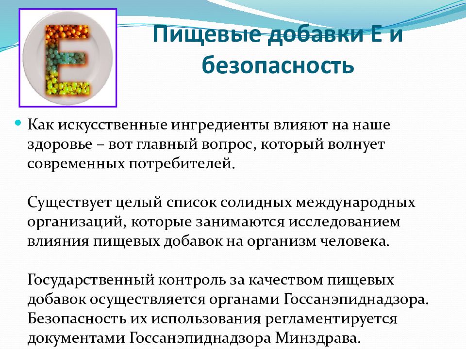 Как искусственные ингредиенты влияют на наше здоровье – вот главный вопрос, который волнует современных потребителей. Существует целый список солидных международных организаций, которые занимаются исследованием влияния пищевых добавок на организм человека. Государственный контроль за качеством пищевых добавок осуществляется органами Госсанэпиднадзора. Безопасность их использования регламентируется документами Госсанэпиднадзора Минздрава.
