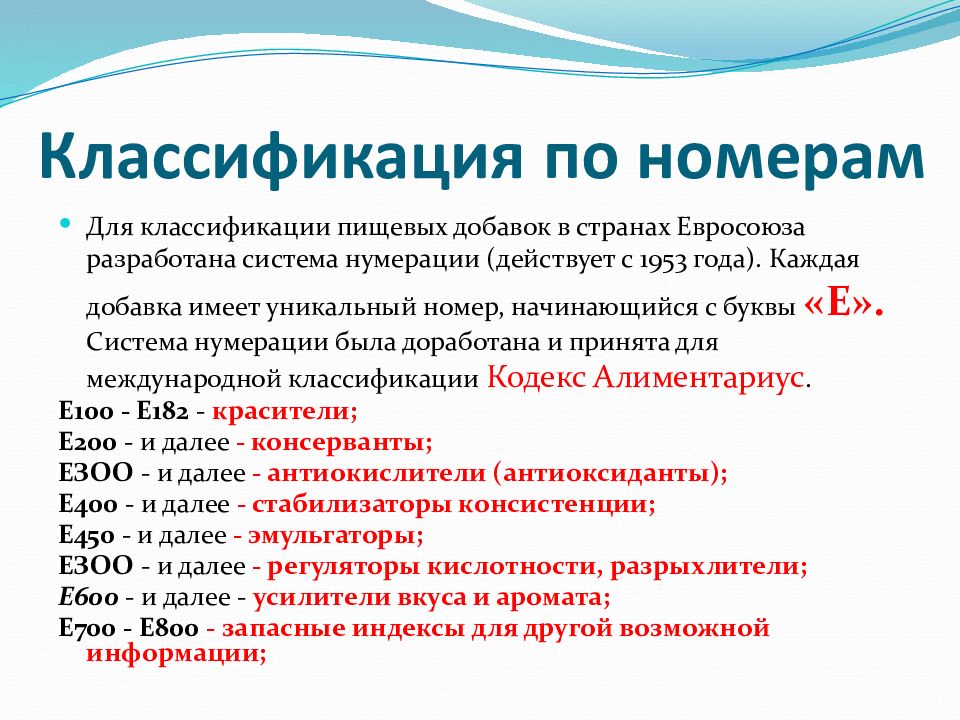 Для классификации пищевых добавок в странах Евросоюза разработана система нумерации (действует с 1953 года). Каждая добавка имеет уникальный номер, начинающийся с буквы «E». Система нумерации была доработана и принята для международной классификации Кодекс Алиментариус. Е100 - Е182 - красители; Е200 - и далее - консерванты; ЕЗОО - и далее - антиокислители (антиоксиданты); Е400 - и далее - стабилизаторы консистенции; Е450 - и далее - эмульгаторы; ЕЗОО - и далее - регуляторы кислотности, разрыхлители; Е600 - и далее - усилители вкуса и аромата; Е700 - Е800 - запасные индексы для другой возможной информации;