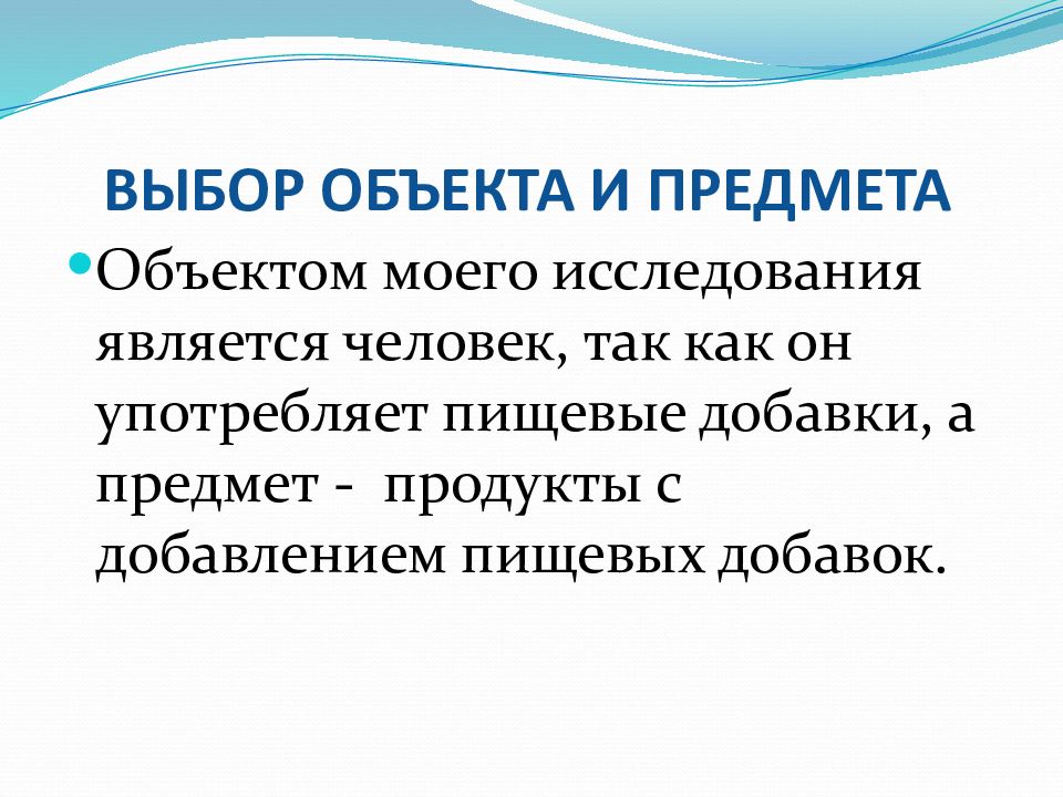 Объектом моего исследования является человек, так как он употребляет пищевые добавки, а предмет - продукты с добавлением пищевых добавок.