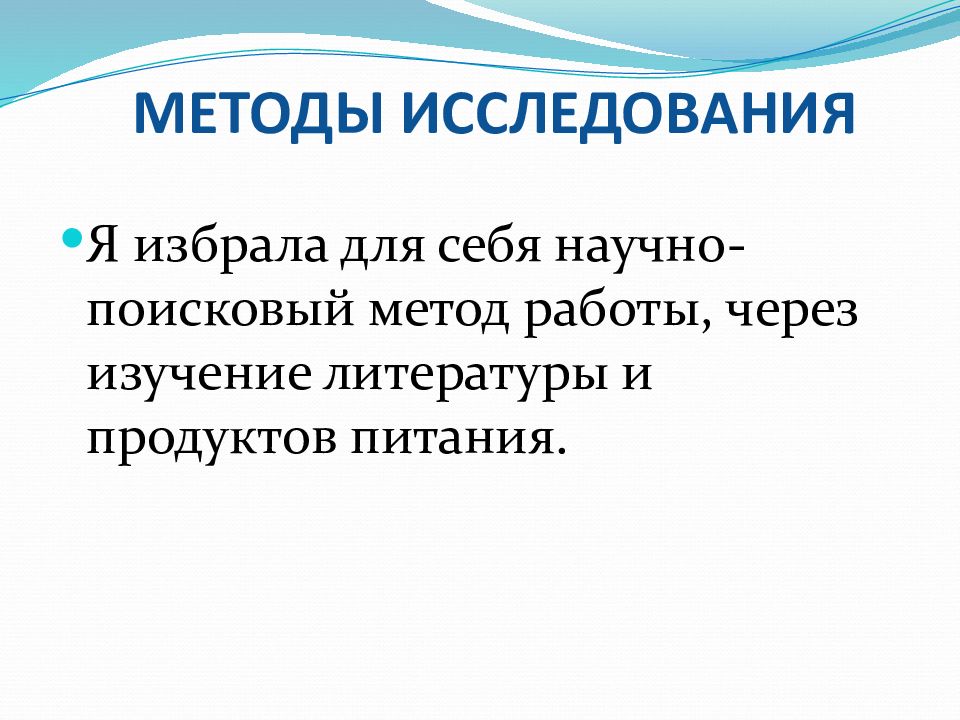 Я избрала для себя научно- поисковый метод работы, через изучение литературы и продуктов питания.