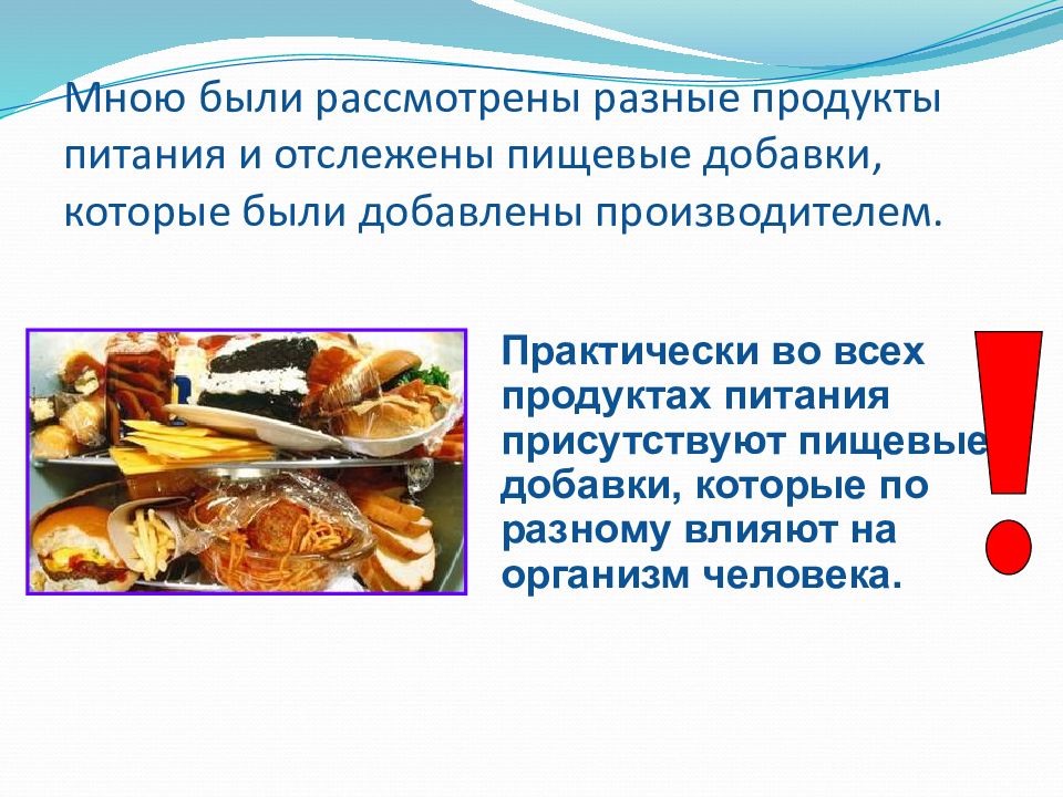 Слайд 12: Мною были рассмотрены разные продукты питания и отслежены пищевые добавки, которые были добавлены производителем