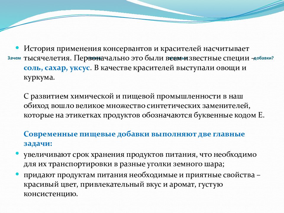 История применения консервантов и красителей насчитывает тысячелетия. Первоначально это были всем известные специи – соль, сахар, уксус. В качестве красителей выступали овощи и куркума. С развитием химической и пищевой промышленности в наш обиход вошло великое множество синтетических заменителей, которые на этикетках продуктов обозначаются буквенные кодом Е. Современные пищевые добавки выполняют две главные задачи: увеличивают срок хранения продуктов питания, что необходимо для их транспортировки в разные уголки земного шара; придают продуктам питания необходимые и приятные свойства – красивый цвет, привлекательный вкус и аромат, густую консистенцию.