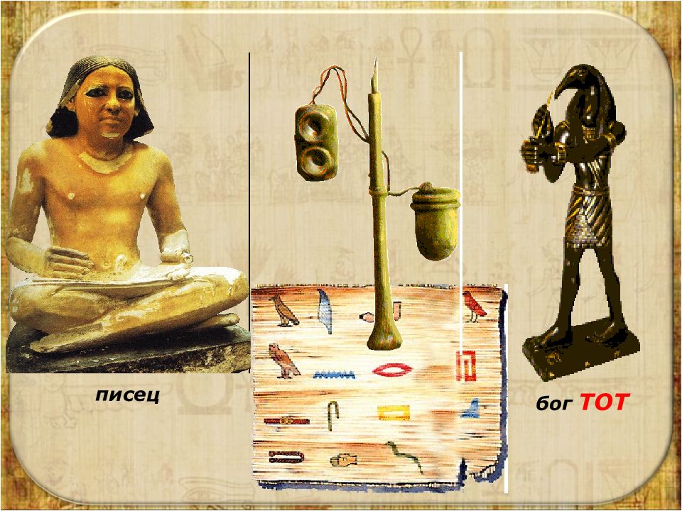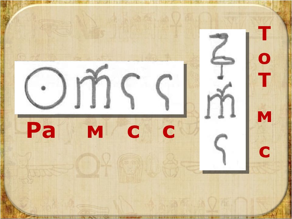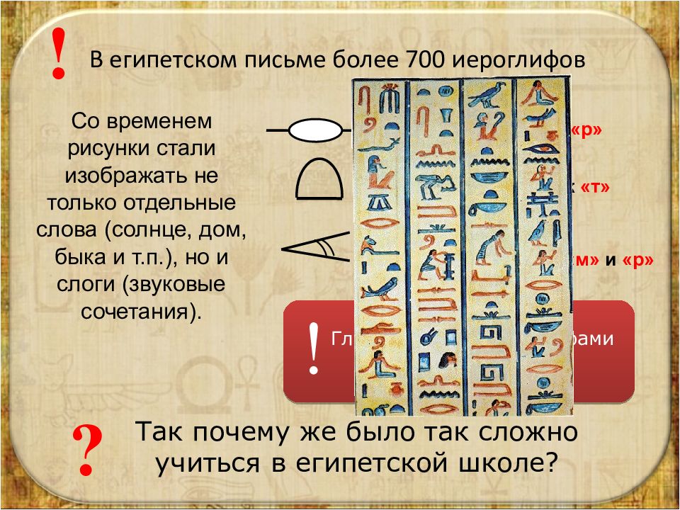 – слово «рот» и звук «р» – слово «хлеб» и звук «т» слово «мотыга» и сочетание звуков «м» и «р» – Гласные звуки иероглифами НЕ передавались ! В египетском письме более 700 иероглифов ! Так почему же было так сложно учиться в египетской школе? ? Со временем рисунки стали изображать не только отдельные слова (солнце, дом, быка и т.п.), но и слоги (звуковые сочетания).