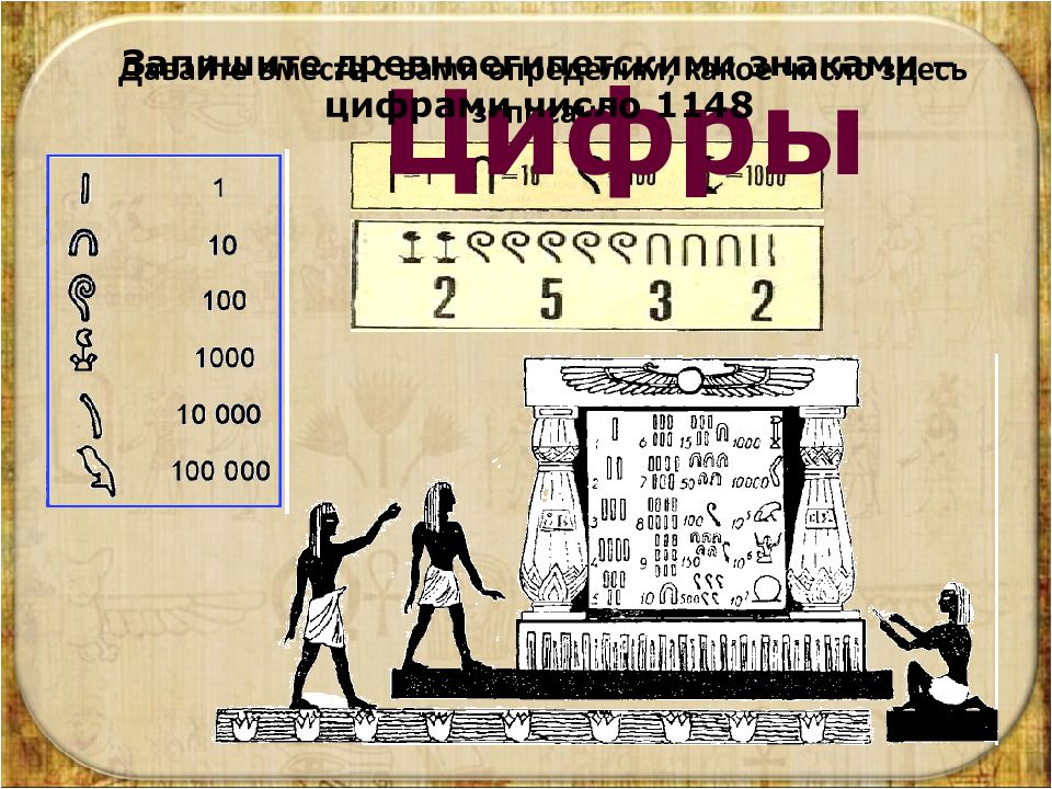 Давайте вместе с вами определим, какое число здесь записано Цифры Запишите древнеегипетскими знаками – цифрами число 1148