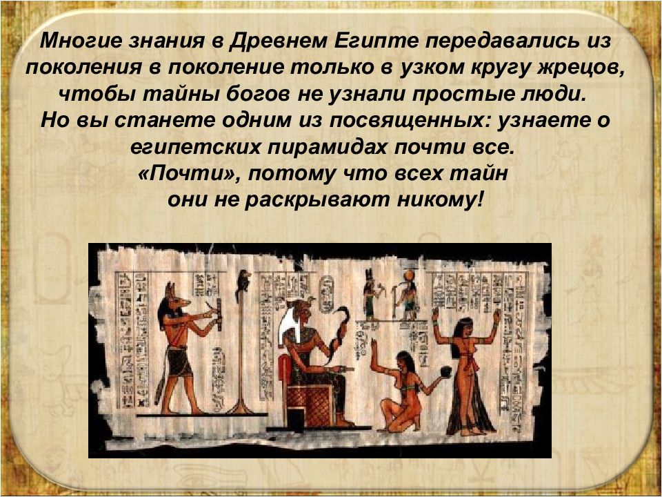 Многие знания в Древнем Египте передавались из поколения в поколение только в узком кругу жрецов, чтобы тайны богов не узнали простые люди. Но вы станете одним из посвященных: узнаете о египетских пирамидах почти все. «Почти», потому что всех тайн они не раскрывают никому!