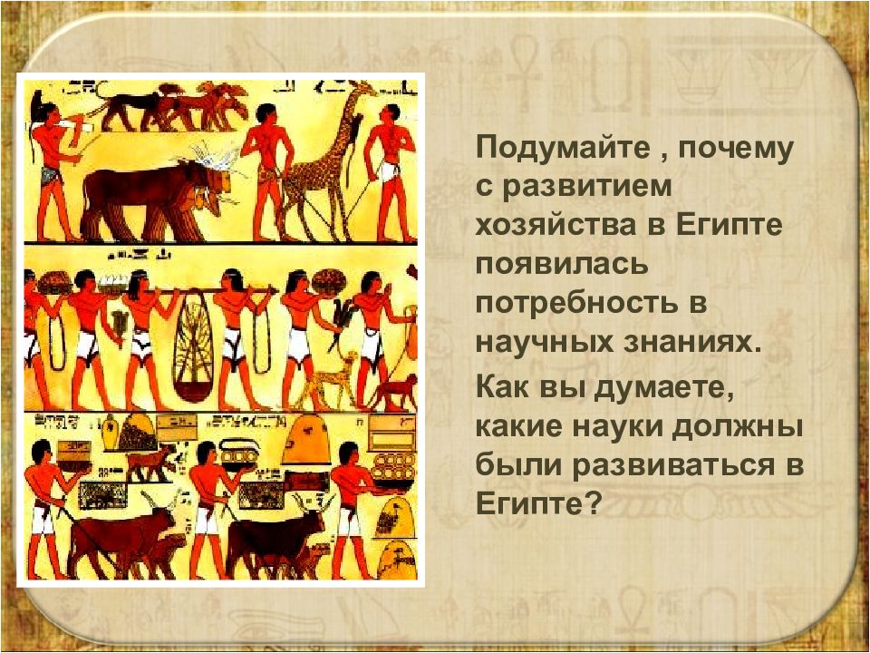 Подумайте, почему с развитием хозяйства в Египте появилась потребность в научных знаниях. Как вы думаете, какие науки должны были развиваться в Египте?
