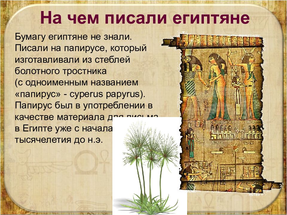 На чем писали египтяне Бумагу египтяне не знали. Писали на папирусе, который изготавливали из стеблей болотного тростника (с одноименным названием «папирус» - cyperus papyrus). Папирус был в употреблении в качестве материала для письма в Египте уже с начала III тысячелетия до н.э.