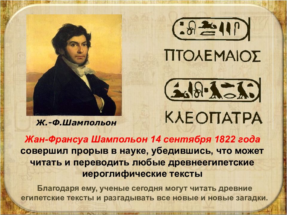 Ж.-Ф.Шампольон Жан-Франсуа Шампольон 14 сентября 1822 года совершил прорыв в науке, убедившись, что может читать и переводить любые древнеегипетские иероглифические тексты Благодаря ему, ученые сегодня могут читать древние египетские тексты и разгадывать все новые и новые загадки.