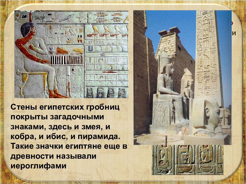 ИЕРОГЛИФЫ – «священные письмена» – древние фигурные знаки египетского письма (и некоторых других), обозначающие целое слово или несколько звуков. Стены египетских гробниц покрыты загадочными знаками, здесь и змея, и кобра, и ибис, и пирамида. Такие значки египтяне еще в древности называли иероглифами