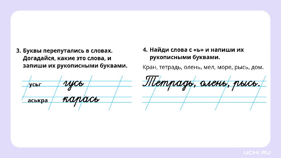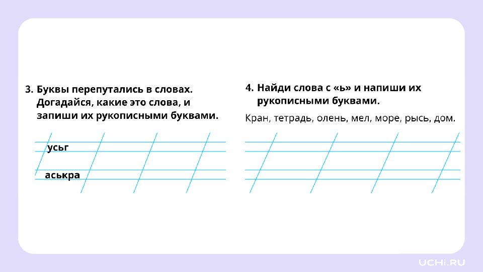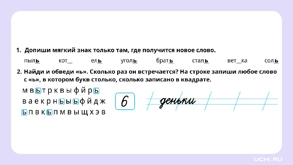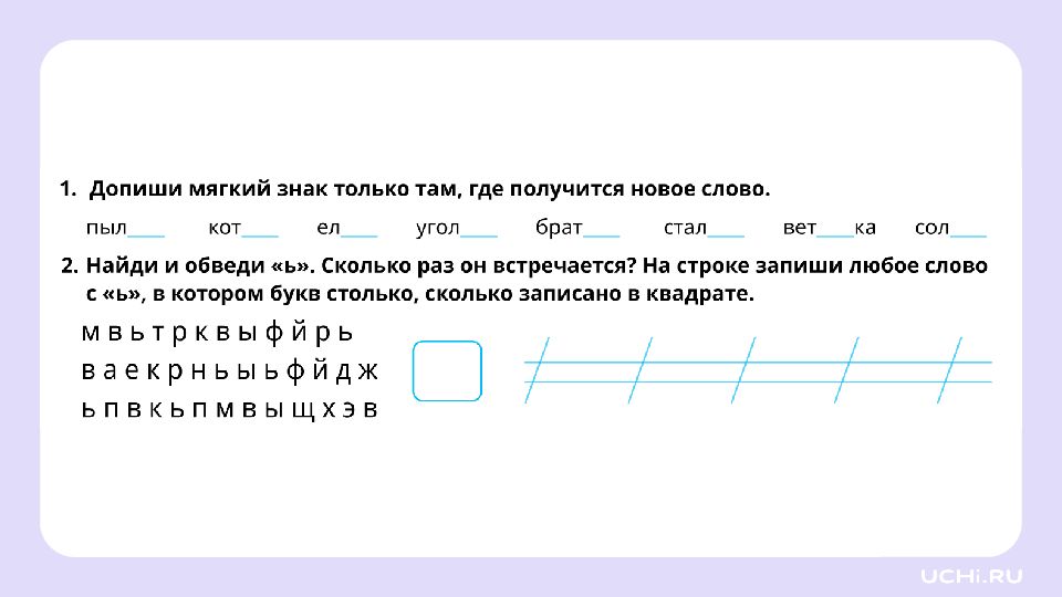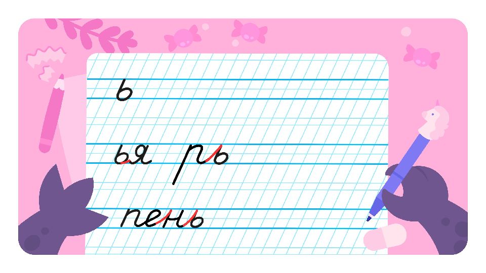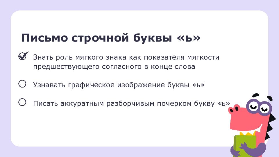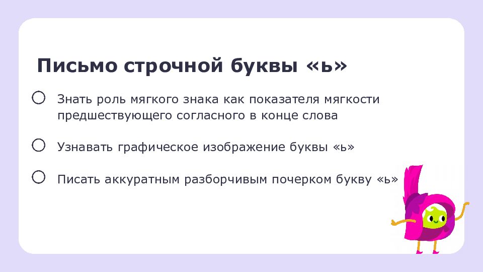Письмо строчной буквы «ь» Знать роль мягкого знака как показателя мягкости предшествующего согласного в конце слова Узнавать графическое изображение буквы «ь» Писать аккуратным разборчивым почерком букву «ь»