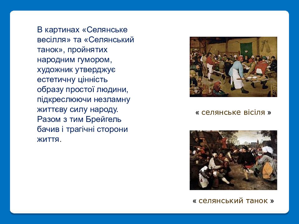 В картинах «Селянське весілля» та «Селянський танок», пройнятих народним гумором, художник утверджує естетичну цінність образу простої людини, підкреслюючи незламну життєву силу народу. Разом з тим Брейгель бачив і трагічні сторони життя. « селянське вісіля » « селянський танок »