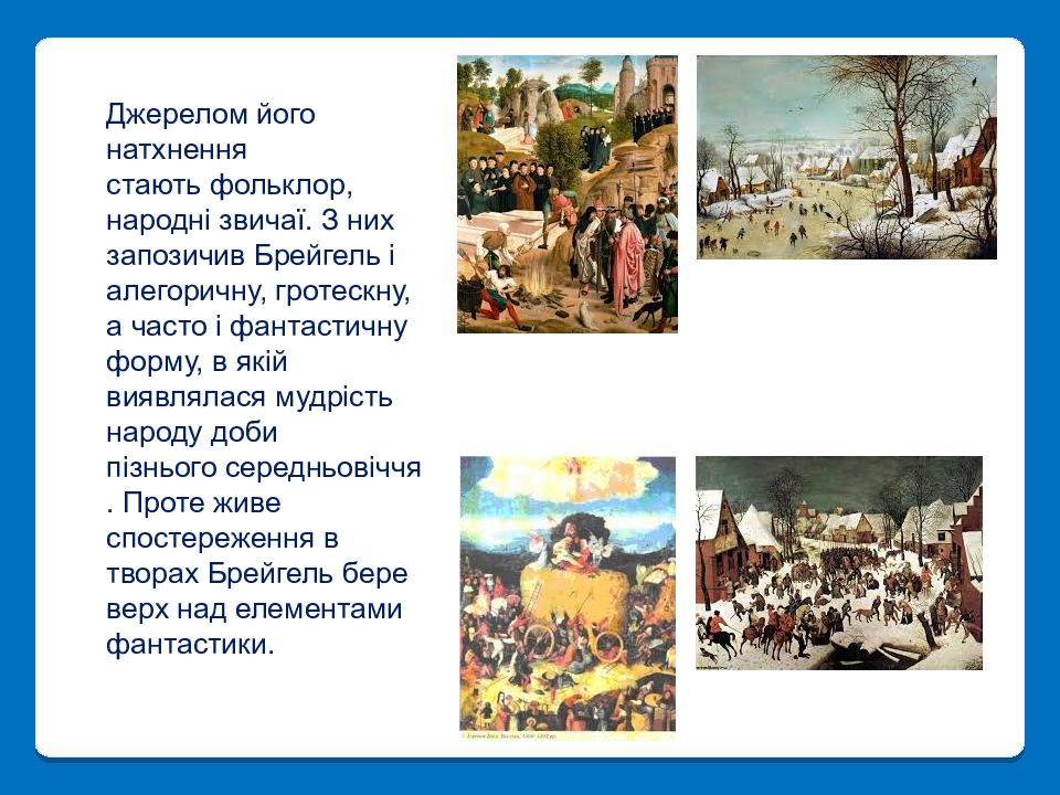 Джерелом його натхнення стають фольклор, народні звичаї. З них запозичив Брейгель і алегоричну, гротескну, а часто і фантастичну форму, в якій виявлялася мудрість народу доби пізнього серед ньовіччя . Проте живе спостереження в творах Брейгель бере верх над елементами фантастики.