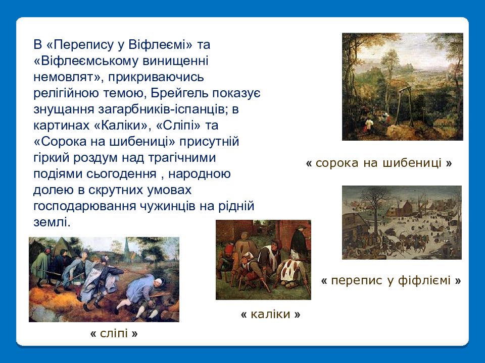 В «Перепису у Віфлеємі» та «Віфлеємському винищенні немовлят», прикриваючись релігійною темою, Брейгель показує знущання загарбників-іспанців; в картинах «Каліки», «Сліпі» та «Сорока на шибениці» присутній гіркий роздум над трагічними подіями сьогодення, народною долею в скрутних умовах господарювання чужинців на рідній землі. « сліпі » « сорока на шибениці » « перепис у фіфліємі » « каліки »