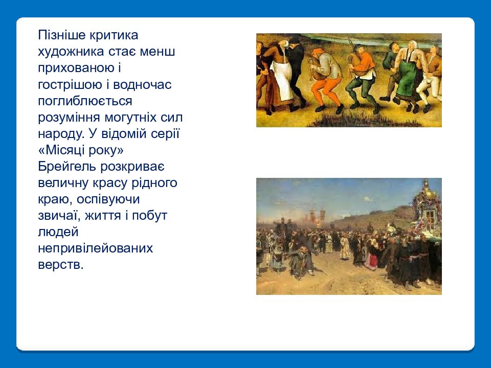 Пізніше критика художника стає менш прихованою і гострішою і водночас поглиблюється розуміння могутніх сил народу. У відомій серії «Місяці року» Брейгель розкриває величну красу рідного краю, оспівуючи звичаї, життя і побут людей непривілейованих верств.