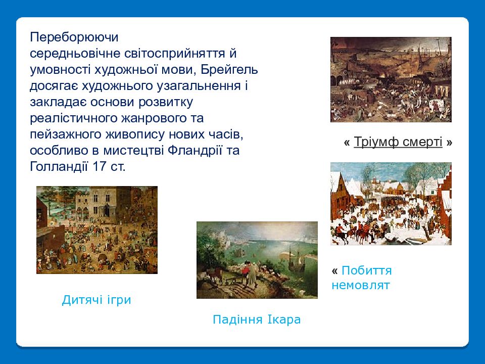 Переборюючи середньовічне сві тосприйняття й умовності художньої мови, Брейгель досягає художнього узагальнення і закладає основи розвитку реалістичного жанрового та пейзажного живопису нових часів, особливо в мистецтві Фландрії та Голландії 17 ст. « Тріумф смерті » « Побиття немовлят Дитячі ігри Падіння Ікара