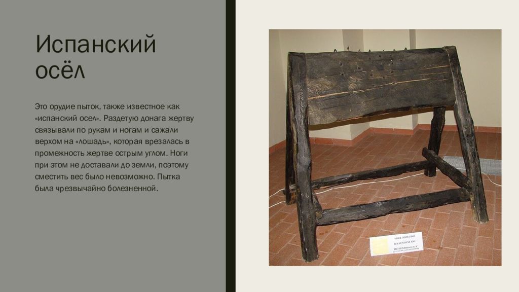 Это орудие пыток, также известное как «испанский осел». Раздетую донага жертву связывали по рукам и ногам и сажали верхом на «лошадь», которая врезалась в промежность жертве острым углом. Ноги при этом не доставали до земли, поэтому сместить вес было невозможно. Пытка была чрезвычайно болезненной.