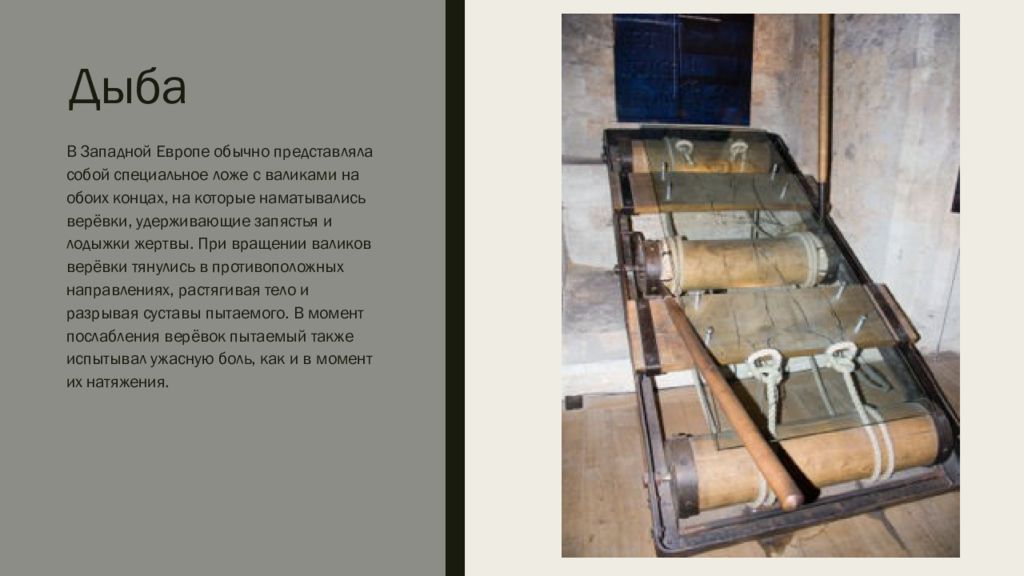 В Западной Европе обычно представляла собой специальное ложе с валиками на обоих концах, на которые наматывались верёвки, удерживающие запястья и лодыжки жертвы. При вращении валиков верёвки тянулись в противоположных направлениях, растягивая тело и разрывая суставы пытаемого. В момент послабления верёвок пытаемый также испытывал ужасную боль, как и в момент их натяжения.
